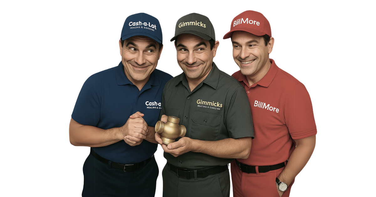 Like “Cash-a-Lot”, who charges by the hour — and doubles the rate the moment it hits 4:59 PM. Or “Gimmicks”? He’ll “diagnose” your system for $180, then hit you with a mystery part from his van (and a price tag to match). And “BillMore”… well, let’s just say he’s in no rush. That coffee break isn’t going to pay for itself.